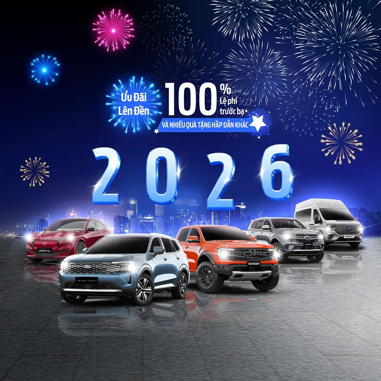 Từ Ranger mạnh mẽ, Everest đa năng, Territory thông minh đến Mustang Mach-E đầy phấn khích và Transit – đối tác kinh doanh tin cậy, mỗi dòng xe Ford đều sẵn sàng cùng bạn bứt phá và chinh phục mọi mục tiêu trong năm mới.